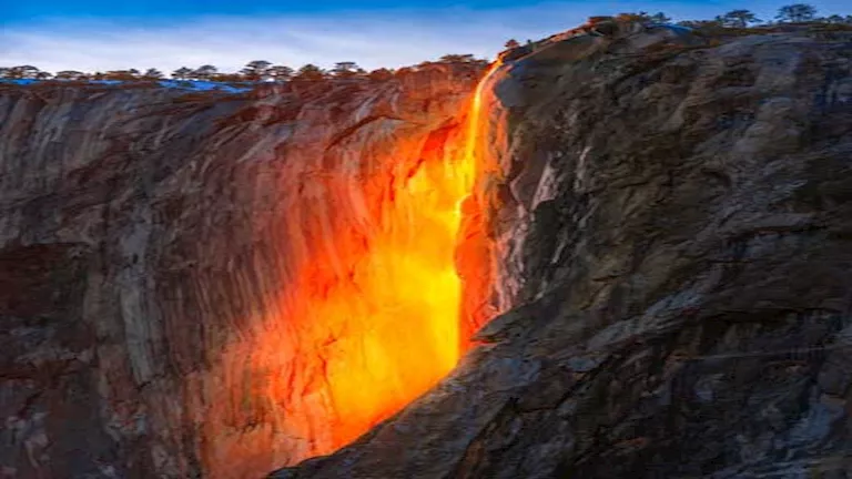 مرة في السنة، يتحول شلال في منتزه يوسيميتي الوطني إلى ظاهرة طبيعية تعرف باسم “شلال النار”، إذ يتوهج الشلال لبضع دقائق من منتصف إلى أواخر فبراير، باللونين البرتقالي والأحمر مع غروب الشمس.
