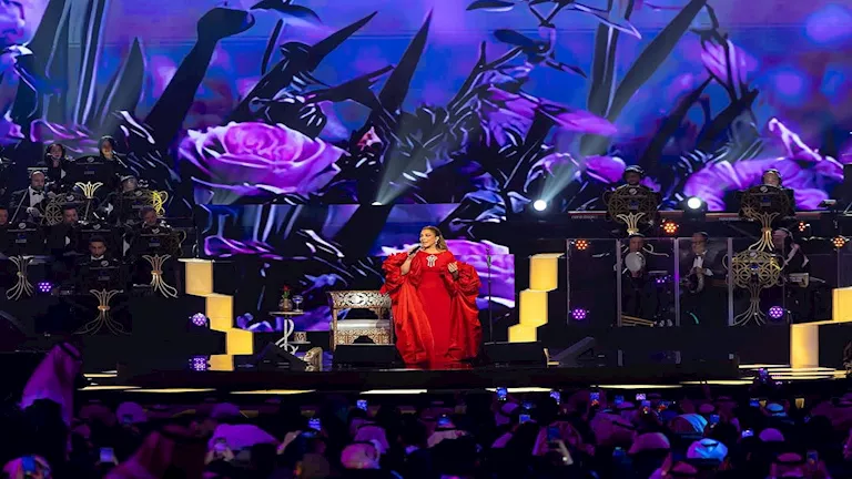تألقت المطربة بفستان طويل باللون الأحمر، تميز بقصة واسعة وأكمام ضخمة أشبه بطبقات من القماش، وجاء الجزء العلوي بتصميم بسيط، زُين ببروش لامع عند منطقة الصدر أضفى لمسة راقية، واعتمدت تسريحة شعر مرفوعة للأعلى، مع مكياج هادئ.