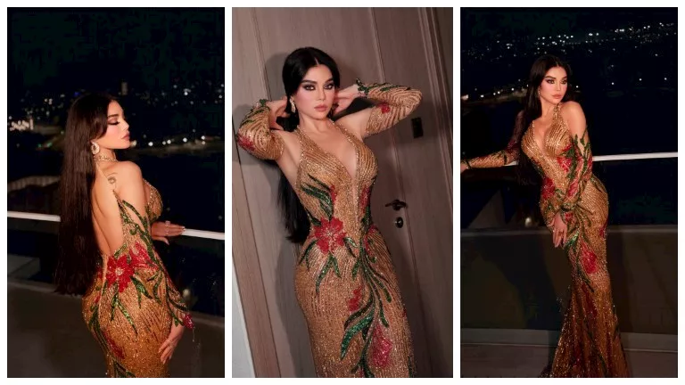 وظهرت هيفاء بإطلالة جريئة مرتدية فستان ذهبي بالكامل مرصع الخرز اللامع، بستايل نجمات الحفلات أو الريد كاربت.