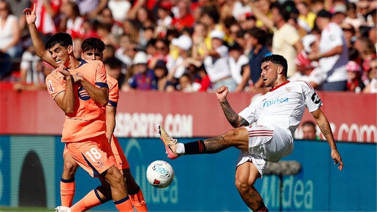 عزز فريق إشبيلية تقدمه أمام برشلونة بهدف ثانٍ، خلال مباراة الفريقين ببطولة الدوري الإسباني موسم 2025-2026.