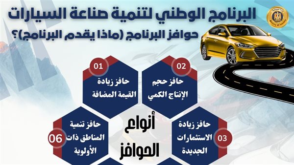 أطلقت وزارة الصناعة، البرنامج الوطني لتنمية صناعة السيارات هو برنامج ينطلق من رؤية وزارة الصناعة لبناء قاعدة صناعية قوية تنافسية لصناعة السيارات والصناعات المغذية في مصر وتهيئة مناخ استثماري عالمي خلق بيئة جاذبة ومستقرة لتوطين صناعة السيارات وجذب كبريات الشركات العالمية، وتعميق التصنيع المحلي، وتحقيق الجدوى الاقتصادية بتشجيع الوصول إلى حجم إنتاج كمي اقتصادي يسمح بخفض التكاليف وزيادة التنافسية، فضلاً عن دعم الميزان التجاري للحد من فاتورة استيراد السيارات ومكوناتها، وفي الوقت نفسه زيادة صادرات مصر من السيارات.