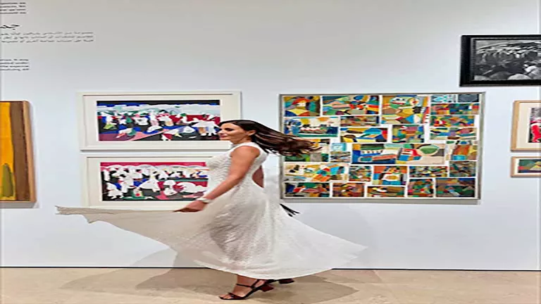 ظهرت ندى مرتدية فستان طويل باللون الأبيض مزين بنقوشات، كما يتميز بتصميمه الواسع.