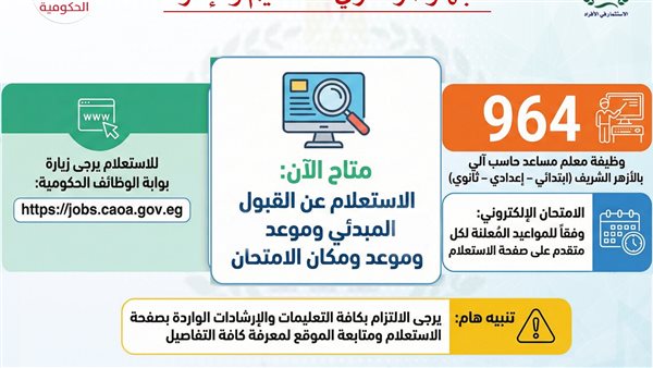 أعلن الجهاز المركزي للتنظيم والإدارة، برئاسة المهندس حاتم نبيل، عن إتاحة الاستعلام عن القبول المبدئي وموعد ومكان خوض الامتحان الإلكتروني للمتقدمين لشغل عدد (964) وظيفة معلم مساعد حاسب آلي للمراحل التعليمية (ابتدائي – إعدادي – ثانوي) بالأزهر الشريف، وذلك عبر موقع بوابة الوظائف الحكومية