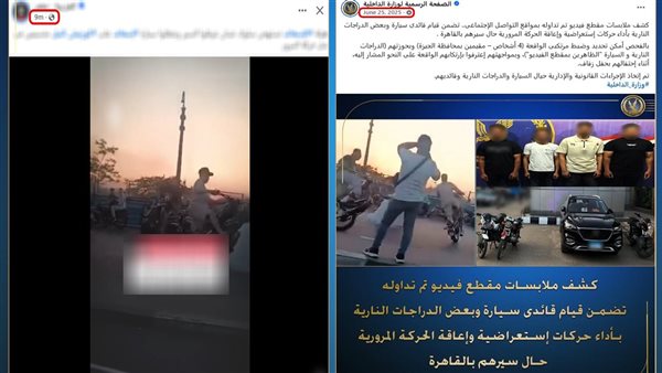أوضحت وزارة الداخلية حقيقة مقطع الفيديو الذي تم نشره بإحدى القنوات الفضائية العربية، نقلًا عن صفحة منسوبة لهيئة الإسعاف المصرية على مواقع التواصل الاجتماعي، والذي تضمن قيام عدد من الأشخاص بأداء حركات استعراضية بدراجات نارية وإحدى السيارات، والتسبب في إعاقة الحركة المرورية أثناء حفل زفاف بكورنيش النيل بالقاهرة.