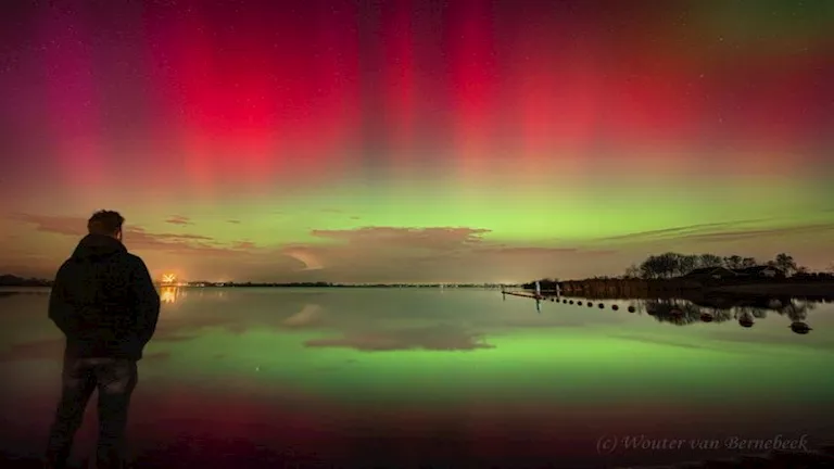 وفي ألمانيا، رقصت الأضواء الشمالية فوق نهر موغلسبري، فيما غمرت ألوان الأحمر والأخضر سماء قرية أباوڤار في المجر، وفقًا لصور المصور روبرت نيميتي.